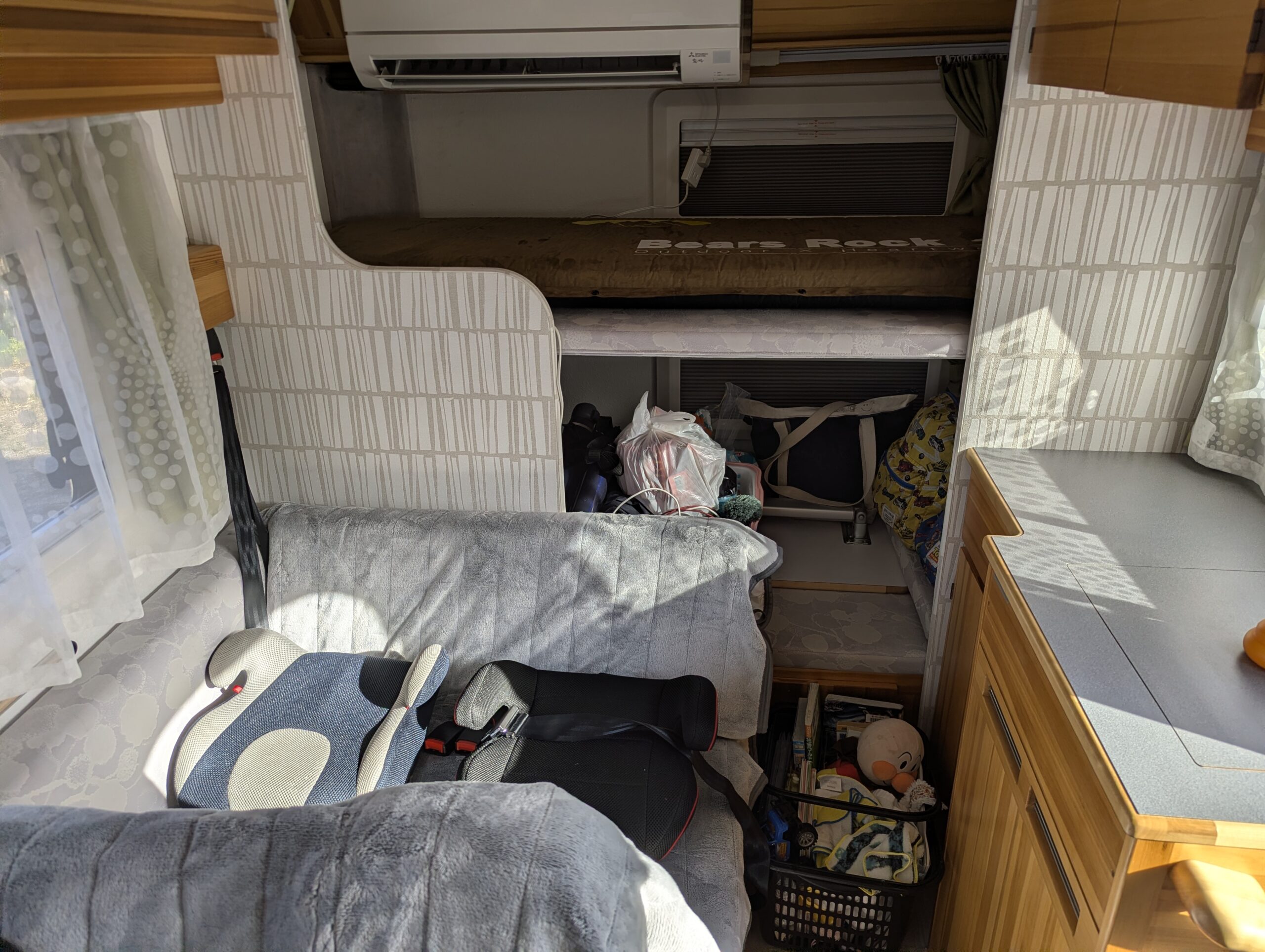 - 車中泊マット:キャンピングカー(アミティ)のベッドスペースはフラットなので不要。普通の乗用車でも毛布・寝袋で十分な場合が多い