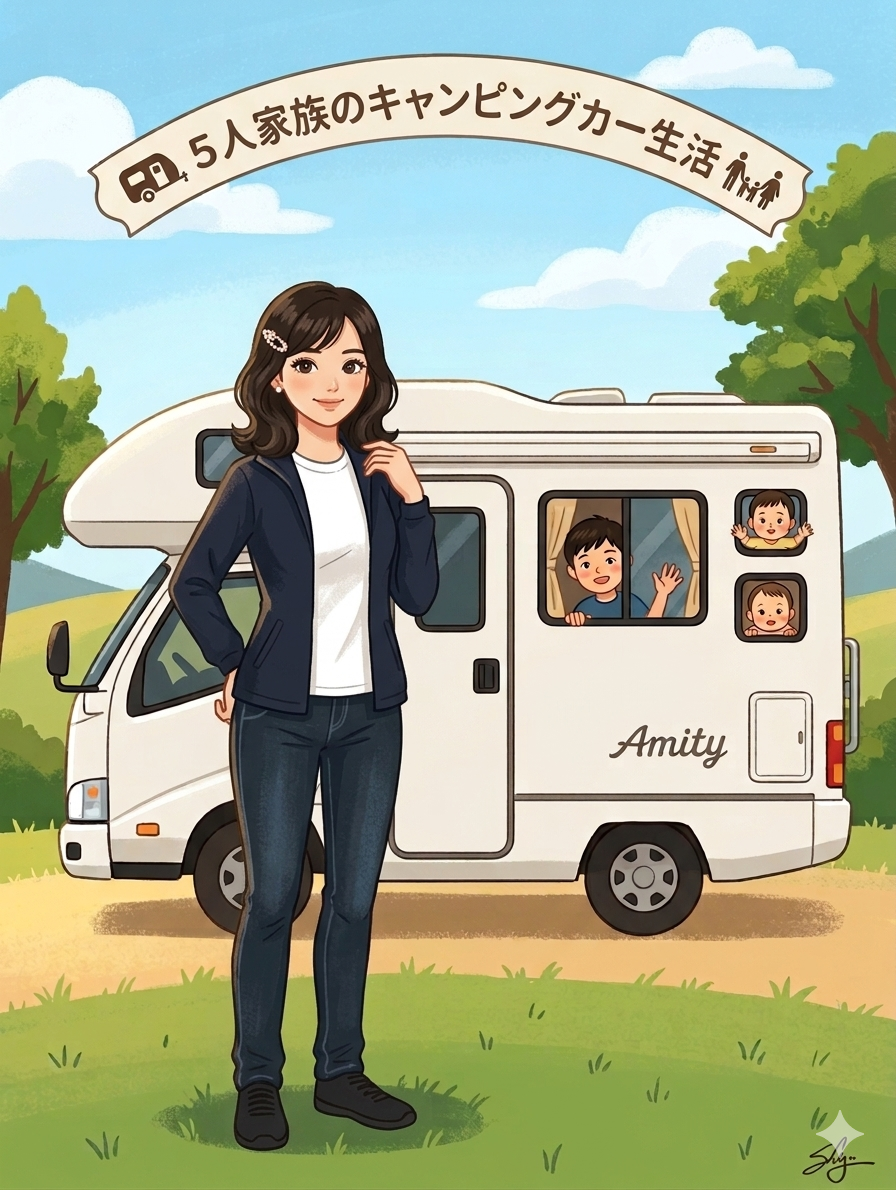 夫・私・子ども3人の5人家族でキャンピングカー生活をしています。このブログでは、大家族でのキャンピングカーライフをリアルにお届けします。
